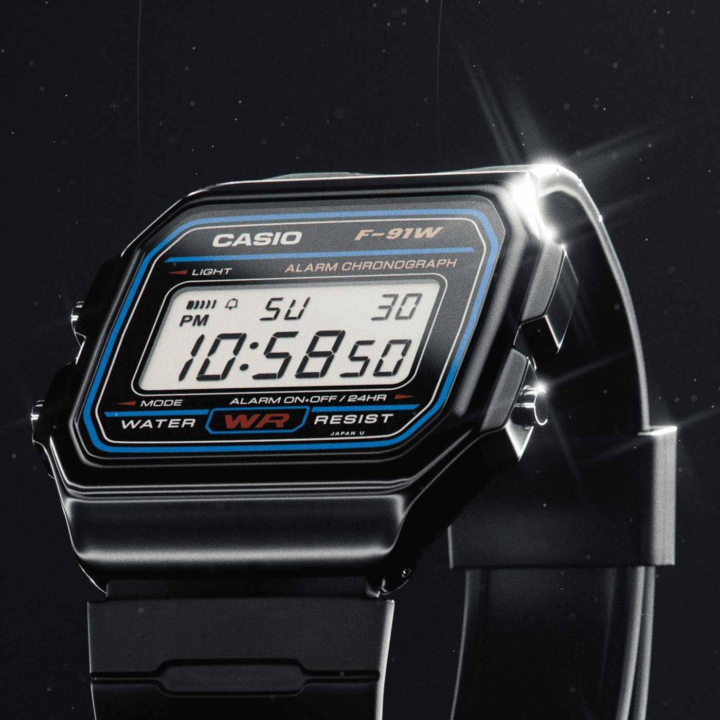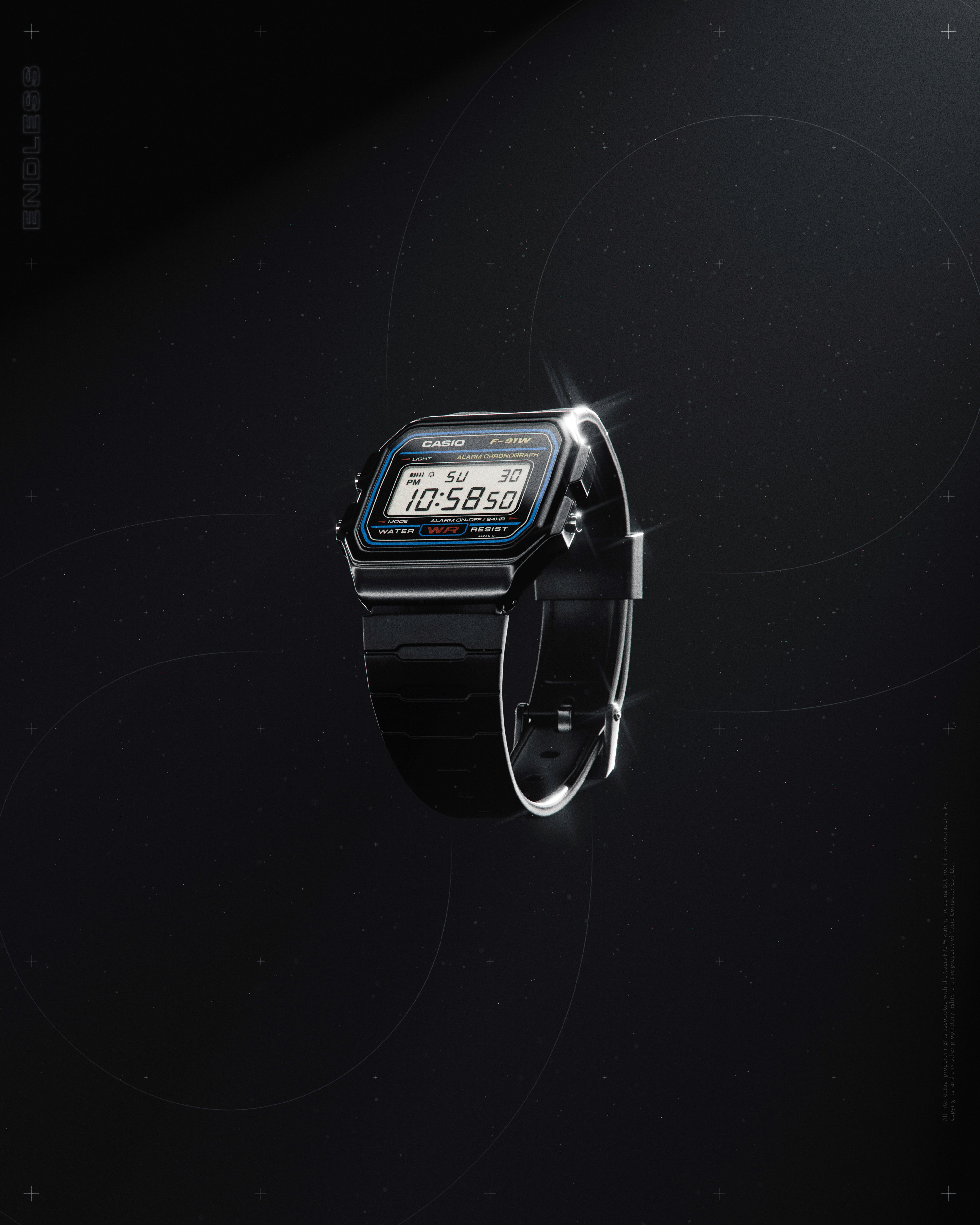 A series of posters presenting the Casio F-91W from an artistic perspective. Styling, lighting, and materials emphasize the watch’s iconic character. It’s a fresh, futuristic take on a classic design.